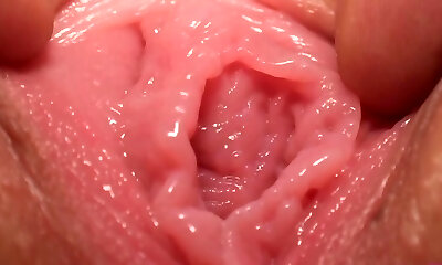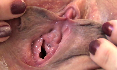Breathtaking model is showing off her stretched narrow slit in closeup