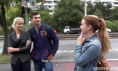 One horny couple fucks pretty hot crimson haired nextdoor babe Marcy