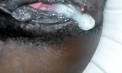 sieh zu, wie mein sperma aus der schwarzen, wolligen muschi fließt und um sex bittet