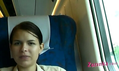 Shameless cockslut Zuzinka flashes her shaved pussy in the train
