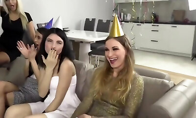 Girls at a party blow on cocks